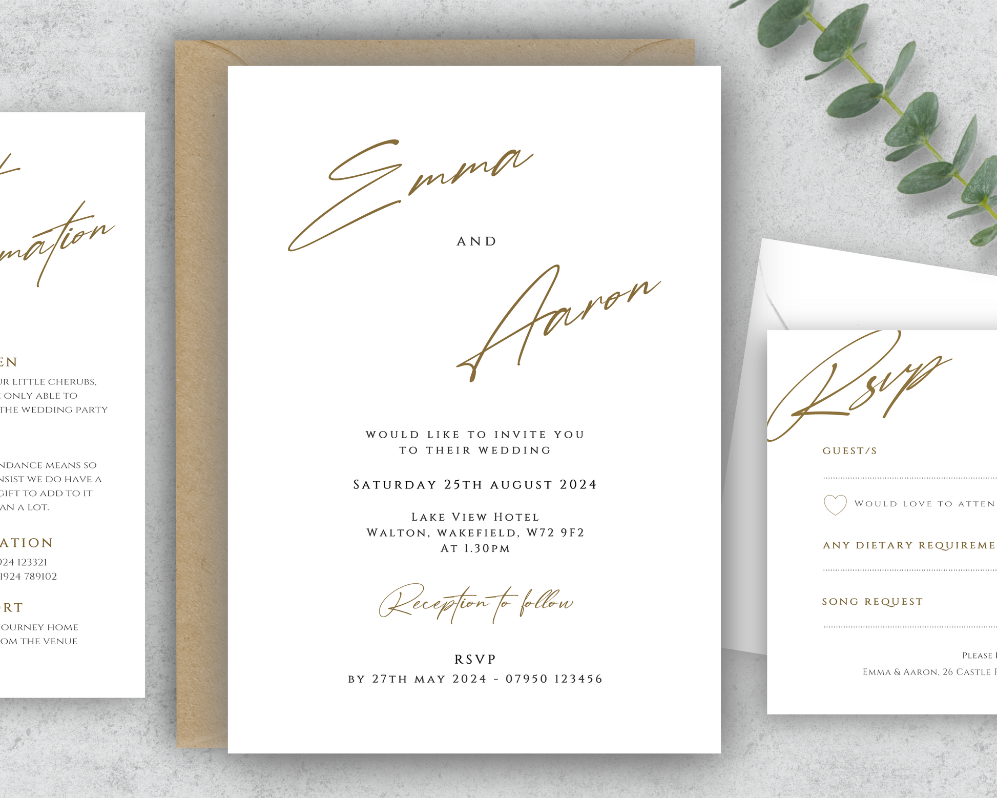 Contemporary design personalised wedding stationery in a simple but elegant design, digitally printed to the highest standard on a premium 300gsm ivory or white textured cardstock.