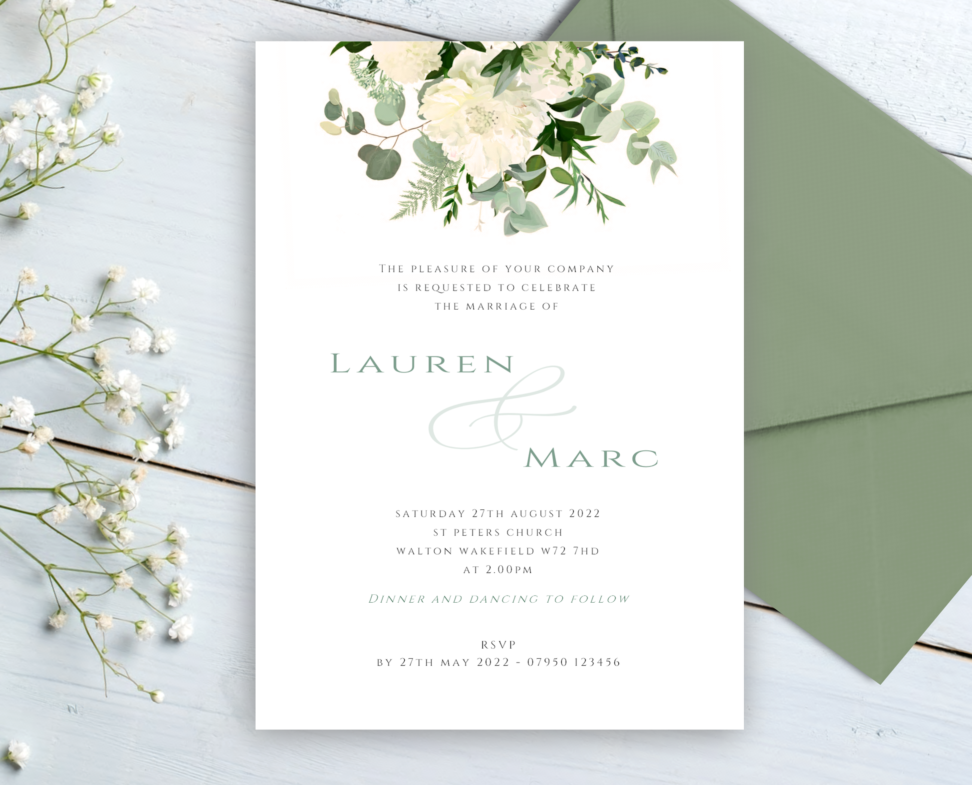 Elegant floral design personalised wedding stationery in a simple but elegant design, digitally printed to the highest standard on a premium 300gsm ivory or white textured cardstock.
